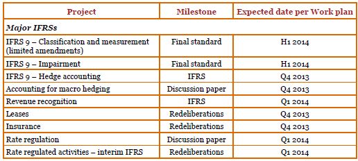 The following summary reflects the next major milestone for the key projects. The boards continue to discuss the Conceptual Framework and a number of narrow scope amendments and research projects.