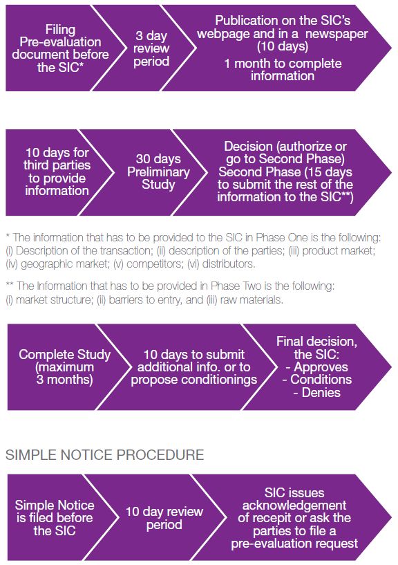 In the other hand, if they comply with the conditions above but jointly have less than 20% of the relevant market, the proposed operation is subject to a Simple Notice form which the SIC shall analyze and respond within 10 business days. Please note that after the review of the information, if the SIC finds that the information presents is not reliable, it shall request the parties to file a Pre-evaluation request.