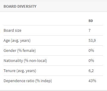 As of February 2017, the board of Blue Sky was composed of: John Kain (Independent Chairman), Michael Gordon (Independent Non-Executive Director), Philip Hennessy (Independent Non-Executive Director), Alexander McNab (Executive Director), Kim Morison (Executive Director), Timothy Wilson (Executive Director) and Mark Sowerby (Founder and Executive Director). Based on the CGLytics analysis, only 43 per cent of the board in 2017 were independent non-executive directors, even after the appointment of two additional independent directors. In addition, the analysis also shows that there are no female members, resulting in a less diverse board 16.