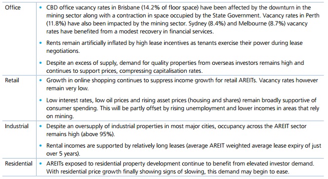 Many AREITs are now trading above their net asset values. Valuations are relatively unattractive and operating income growth prospects are low. Nevertheless potential merger and acquisition activity and investor demand for yield may continue to provide some support for the sector. On balance we recommend investors retain a modest underweight exposure.