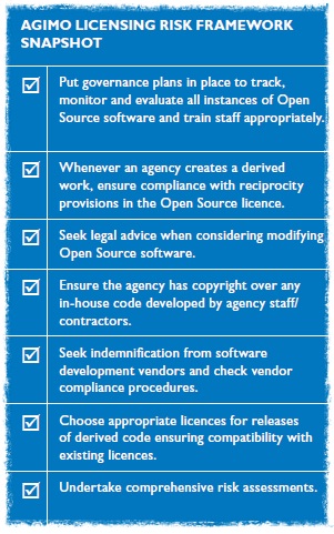 Adopting Open Source solutions is not without risk. While these risks are, in many cases, not fundamentally different from the risks posed by proprietary software, agencies should adhere to the risk management framework for Open Source highlighted by AGIMO (see the side bar for a snapshot version and link to the Guide on page 4). 20