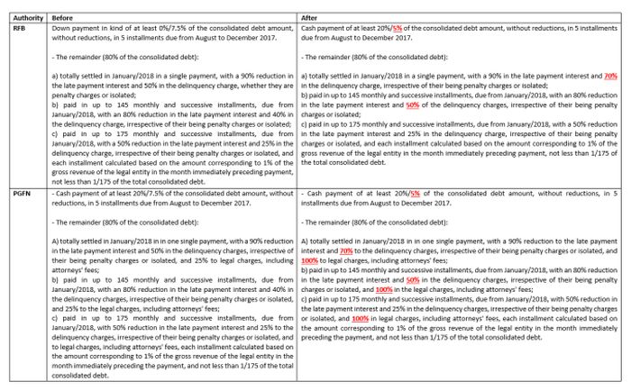 - Decreased minimum down payment amount for debts not exceeding R$15 million, changed to 5% (five per cent) of the consolidated debt amount, without deductions, in up to five monthly and successive installments;