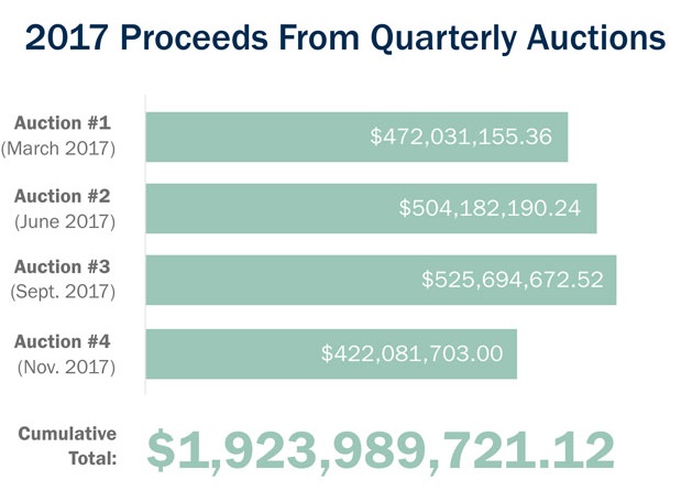 Together, the four auctions generated over $1.9 billion in total proceeds. Pursuant to Ontario's Climate Change Mitigation and Low-carbon Economy Act, 2016, auction proceeds are held in the Greenhouse Gas Reduction Account to fund green initiatives that support the reduction of GHG emissions. The province's funding priorities are outlined in its Climate Change Action Plan. A breakdown of the proceeds from each quarterly auction is set out below:2