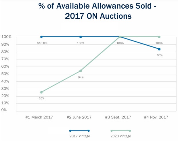In the first year of its cap-and-trade system, Ontario held four auctions of GHG allowances, each offering 25.3 million current vintage allowances and 3.1 million future vintage allowances. In total, Ontario has offered 101.2 million current vintage allowances through the auctions, representing 71% of the 2017 allowances available under Ontario's cap. The other 29% were either distributed free of charge by the Ministry of the Environment and Climate Change (MOECC) or held in the Ontario price containment reserve. Whether auctioned or allocated free of charge, allowances are the main compliance instrument that capped emitters can use to cover their emissions under the cap-and-trade program.