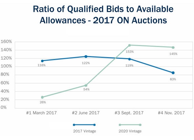 To help maintain a stable carbon price, Ontario imposed a reserve price for auctioned allowances, essentially a floor price below which allowances would not be sold. The first figure below highlights the reserve price and the actual settlement price at each auction. The subsequent figures show the proportion of available allowances sold, and ratio of qualified bids to available allowances.3 Notably, after three consecutive fully subscribed auctions for current vintage allowances, the fourth quarter auction saw a significant decline in the percentage of available 2017 vintage allowances sold (down to 83%) as well as a lower settlement price (crossed under $18 for the first time). This drop could potentially be attributable to uncertainties surrounding the upcoming 2018 provincial election, and expectations regarding market linkage (which is likely to increase liquidity and drive down prices for Ontario participants).