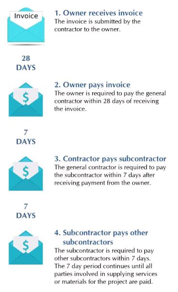 A contractor who receives full payment of a proper invoice within the 28 days must, no later than 7 days after receiving payment, pay each subcontractor who supplied services or materials included in the proper invoice.