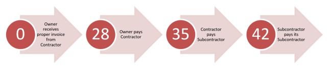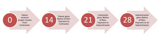 Simplified snapshots of the payment and non-payment notice timelines are provided below, with the numbers in the graphic representing the maximum number of elapsed days after the proper invoice is received by the owner.