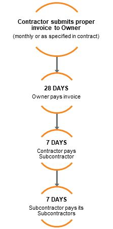The prompt payment provisions impose statutory deadlines for payments to contractors and subcontractors during construction projects. The deadlines begin to run from the date of delivery of a "proper invoice" by the general contractor to the owner. In short, the owner is required to pay the contractor within 28 days of receiving a proper invoice from the contractor, who then has 7 days to pay its subcontractors after receiving payment from the owner. Prompt payment applies down the construction pyramid, with deadlines prescribed by the Act at each level.3