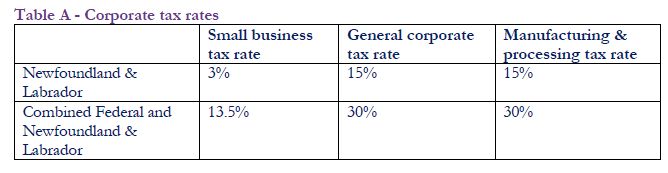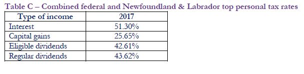 The combined federal and Newfoundland top marginal tax rate (i.e., for taxable income in excess of $202,800) on various types of income for 2017 is summarized in Table C.
