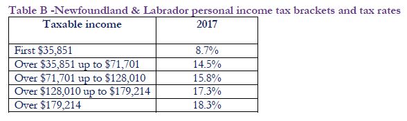 The 2017 Newfoundland and Labrador personal tax rates, which were announced in the 2016 budget, are summarized in Table B.