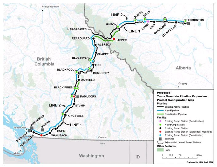 In 2013, Kinder Morgan applied to the National Energy Board (NEB), seeking an expansion of the 1,150-kilometre Trans Mountain pipeline that runs from Edmonton, Alberta to Burnaby, British Columbia. The expansion would nearly triple the pipeline's capacity from 300,000 to 890,000 barrels per day. The NEB undertook a lengthy review process culminating with a May 2016 Report. Subsequently, in November 2016, the federal government issued its approval of the project, setting out 157 conditions to be met.