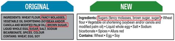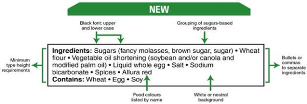 Changes to the list of ingredients include grouping sugars-based ingredients in brackets after the name 'sugars' to identify all of the sources of sugars added to a food and listing food colours by their individual common names. Formatting changes2, including presenting the text of the list of ingredients in black font on a white or neutral background, providing minimum type height requirements for ingredients, using bullets or commas to separate ingredients, and using both upper and lower case letters for ingredients in the list are all aimed at making the list of ingredients easier to find, read and understand. The same formatting changes will also apply to any 'contains' statement within an ingredient list indicating the presence or potential presence of priority food allergens, gluten sources and added sulphites.