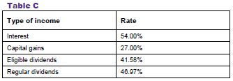Table C illustrates the combined 2016 federal-Nova Scotia marginal rate of tax on various types of income for the top marginal rate of tax: