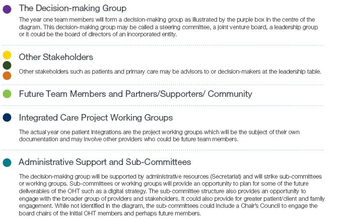 Initially, entities will likely retain their separate autonomy and governance structures, while coming together in a collaborative or shared governance model or decision-making framework to enable achievement of the year one deliverables of the OHT. The year one model is expected to evolve as the work of the OHT expands, however, even at maturity, some OHT members may continue to have separate governance while participating as members of the team. Team member participation at maturity might be through shared governance (such as a joint executive committee), or through contract (such as a service or partnership agreement or funding agreements), or through other arrangements.