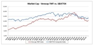 2015 was a year of two halves for Canadian mid-market Technology, Media and Telecom (TMT) companies. Starting strong, then struggling under the weight of slowing Chinese growth, and both the oil & gas sector and Canadian dollar in steep declines. Over the year, public mid-market TMT companies, as measured by the Veracap TMT Index (VTI)(1), were down by 4.7% while the large market cap tech index, the S&P/TSX Capped Information Technology Index was actually up by 13.5%. The VTI reached a high of 15,589 (20.5% increase from the beginning of the year) on June 25, 2015 and then began to decline into year end.