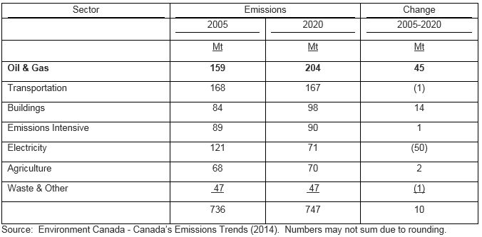 According to Environment Canada's Emission Trends Report for 2013 and 2014, this increase in carbon emissions from the oil sands is tied principally to past and projected increases in production. To at least some extent, the growth in emissions as at 2020 from the oil and gas sector may be lower than projected, due to recent declines in global demand and the cancellation or deferral of a number of oil sands projects. But the overall trend is likely to remain broadly consistent with the projections from Environment Canada.
