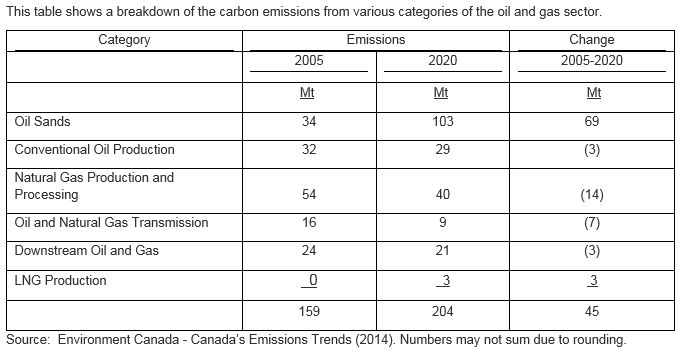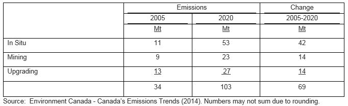 The following table breaks down the sources of carbon emissions from oil sands activities as at 2005 and projected in 2020.