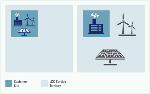 Figure 1: Under the Original Proposal, establishing a billing method for single-entity virtual net metering would allow a renewable energy generation facility to be located outside the customer site as long as it is within the LDC service territory.  |