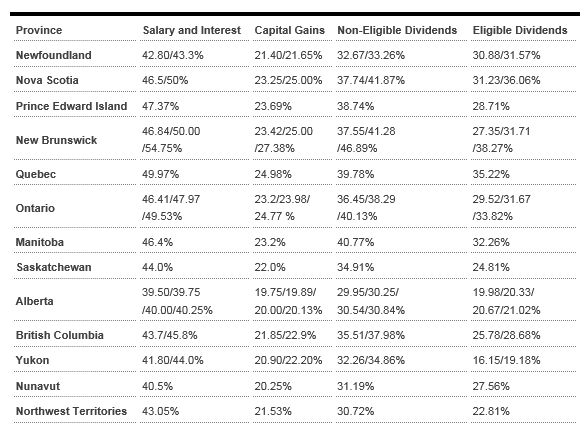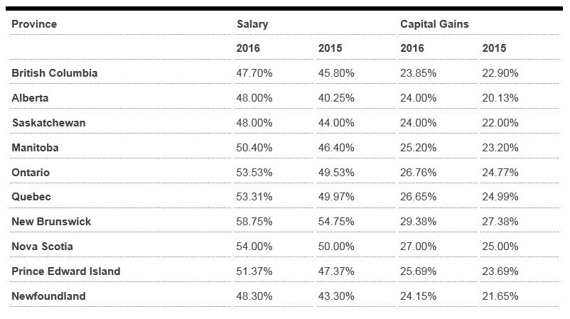 The new government has proposed a top marginal tax bracket of 33 per cent for individuals earning more than $200,000/year. The chart below summarized the potential new rates for salaried employees in each province if the changes go through: