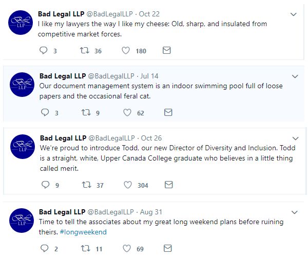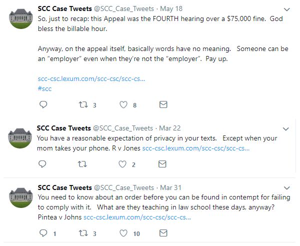 These are often informative, but not always the most entertaining. Thank goodness for my favourite subcategory of Law Twitter: