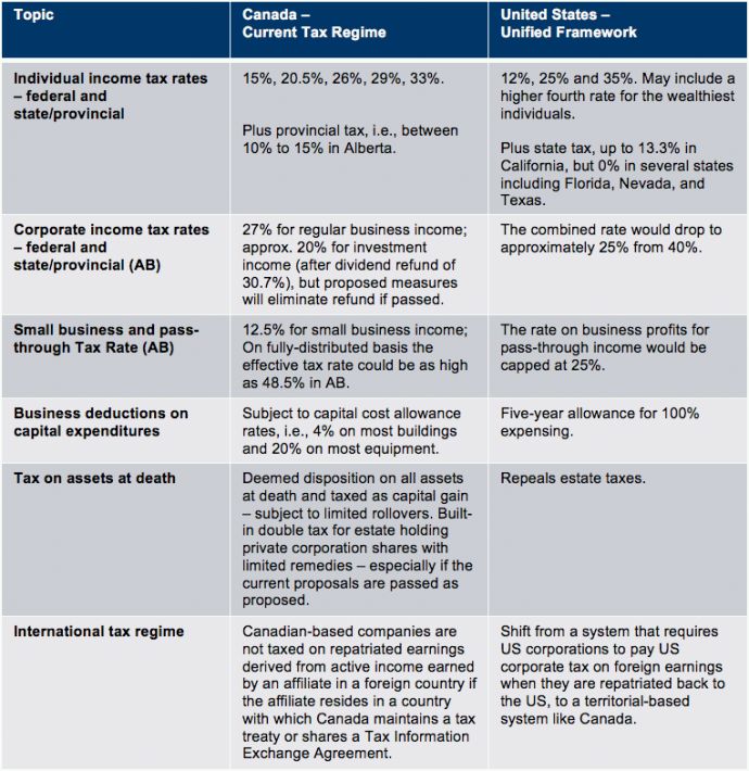 The chart below summarizes some of the critical elements of the Canadian tax system versus the US tax system under the Unified Framework.