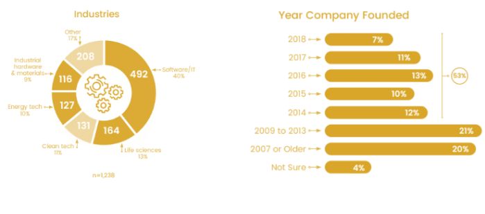 Among technology companies operating in Alberta, the most common are software/IT companies (40%), life sciences (13%), cleantech (11%), energy tech (10%), and industrial hardware and materials (9%) companies. Over 50% of the tech companies in Alberta were started in 2014 or later.