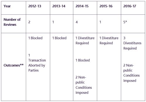 - Please note that because O-Net/ITF was reviewed twice, there have been 13 reviews of 12 transactions, and one of the five "divestiture required" outcomes set out in the table above was converted to a "non-public conditions imposed" outcome.