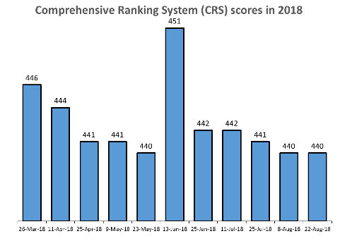 August 22, 2018 - Today, the Department of Immigration, Refugees and Citizenship Canada (IRCC) invited applicants with a Comprehensive Ranking System (CRS) score of 440 to apply for Canadian permanent residence. The CRS cut-off remained the same as the previous draw on August 8, 2018. A total of 3750 invitations were issued in today's draw. The number of invitations issued was exactly the same as the previous draw on August 8, 2018.