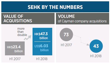 Whilst growth in Asian M&A activity remains slow, with deal volume declining. The first half of 2018 displayed an upwards trajectory in both deal value and number of Cayman public companies listed on the SEHK.