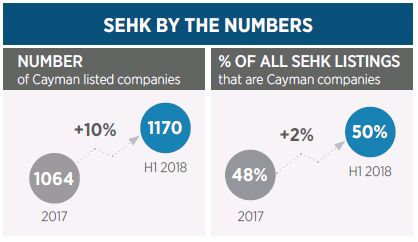 Cayman public companies listed on the SEHK grew to 1,170 in the first half of 2018, representing a 10% increase since the end of 2017. Conversely, the market cap was HK$12.25 trillion (US$1.56 trillion), a decrease of HK$250 billion (US$31.8 billion) since 2017. Despite this, for the end of the first half of 2018, 50% of all SEHK listings were Cayman companies (2% increase on 2017), with an average market cap of HK$11 billion (US$1.4 billion).