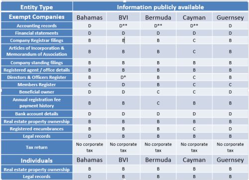The following table indicates the information that is available on Exempt Companies in a number of offshore jurisdictions:4