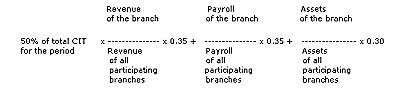 Step 3: Allocation among the participating branches. The 50 percent of provisional CIT allocated to the participating branches in Step 1 will be further allocated among those branches based on three factors: gross revenue, payroll, and total assets. CIT paid to the tax bureau at one participating branch location should be equal to the following: