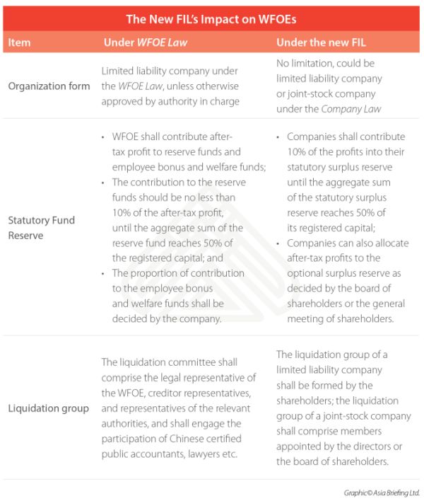 If we must find some, the limitation of the organization form on WFOE will be removed after the new FIL comes into force. Besides the limited liability company form, a WFOE can also take the form of joint-stock company or a sole proprietorship, after the Sole Proprietorship Enterprise Law is amended.