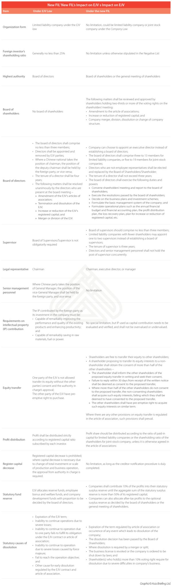 After the FIL is fully implemented, there will no longer be FIEs in the form of CJVs. Existing EJVs will need to amend their article of associations and change their governing structure and operating rules within the five-year transitional period, in accordance with the Company Law.