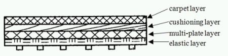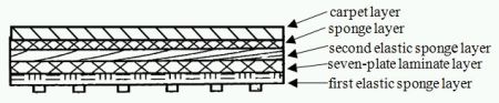 The alleged product comprised of a first elastic sponge layer arranged at the bottom, a seven-plate laminate layer adhered to the first elastic sponge layer, a second elastic sponge layer adhered to the seven-plate laminate layer, a sponge layer adhered to the second elastic sponge layer, and a carpet layer laid on top of the sponge layer (as illustrated below).