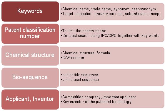 The patent search element list generally includes Chinese keywords, English keywords, patent classification numbers, chemical structures, biological sequences, applicants and inventors.