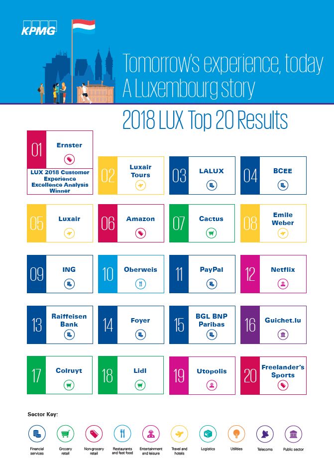 KPMG surveyed over 1,000 customers for the Luxembourg report, covering 80 brands across 10 sectors. Scoring exceptionally highly on integrity, Ernster topped the table, with LuxairTours and LALUX in second and third places respectively. With regards to sector performance, financial services (e.g. banks and insurance companies) came out on top with an average score of 7.14 (out of 10), 6% above the national average.