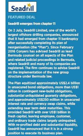 Bermuda companies have seen a busy half year, with two IPOs, a spike in M&A activity and the conclusion of Seadrill Limited's major restructuring (see right). In general, market activity by Bermuda public companies in H1 2018 has been focused in the telecoms, insurance, financial, aviation and pharma sectors.