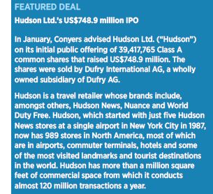 - Bermuda domiciled travel retailer Hudson Ltd. (NYSE:HUD) launched its US$748.9 million Initial Public Offering of Class A common shares. (January)