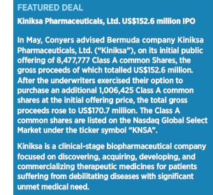 - Bermuda based clinical-stage biopharmaceutical company Kiniksa Pharmaceuticals, Ltd. (NasdaqGS:KNSA) launched its US$152.6 million Initial Public Offering of Class A common shares. (May)