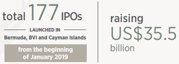 IPO activity fell globally in 20 19, with major US e xchanges experiencing a decrease of 2% and the number of IPOs in Asia gener ally falling by 34%. However, 94 C ayman companies launched IPOs on the SEHK in 2019 from January to the end of Oc tober, with offerings totalling approximately US$25.5 billion, an incr ease from US$20 billion in 20 18. As usual, Conyers Hong Kong and Singapore offices saw a significant share of the deals, particularly in the r eal estate and property development sectors.