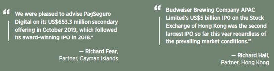 In the Cayman Islands, PagSeguro Digital's award-winning IPO in January 2018 was followed up with a US$653.3 million secondary offering in October 2019. A highlight for the Cayman office has been a number of insurance-related deals, particularly for companies in the healthcare sector, including Northwestern Memorial Healthcare and Fairview Health Services.