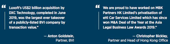 Our Asian offices in Hong Kong and Singapore have continued to see significant deal flow in 2019, particularly with regard to capital markets. IPO activity remains strong in both offices. Standout deals include Budweiser Brewing Company APAC Limited's US$5 billion IPO in September and Luckin Coffee's US$570 million IPO in May, along with MBK Partners' US$937.5 million privatization of eHi Car Services Limited by way of merger.