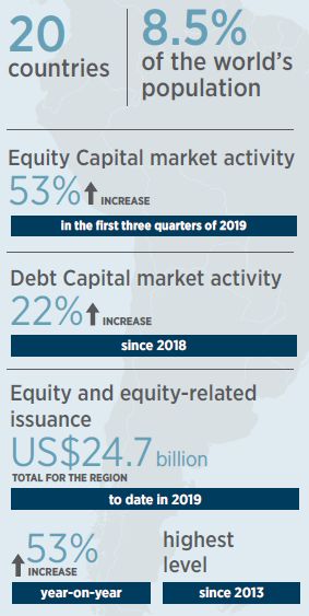 Comprised of 20 countries and accounting for roughly 8.5% of the world's population, Latin America is a major market with a global influence. Deal-making trends in Latin America displayed a 53% increase in equity capital market issuances in the first three quarters of 2019. Debt capital market activity also increased 22% since 2018. However, political unrest is leading to volatility in some markets.