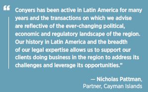 The Conyers Latin America Group is made up of attorneys (some of whom are fluent in Spanish and/or Portuguese) with many years of experience advising clients on matters originating from or related to the region. Through well-established relationships with local and multinational corporations, financial institutions, asset managers, investors, family offices, law firms and service providers in Latin America, we offer in-depth regional knowledge of business practices and structures.