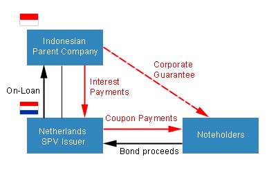 Most international bond issuances by Indonesian corporations employ an 'SPV issuer' structure designed to limit withholding tax on interest income. Indonesian corporations are required to withhold tax on interest payments to offshore parties at the rate of twenty percent (20%), unless this rate is reduced by an applicable double taxation treaty. Under the usual SPV issuer structure illustrated below, an Indonesian corporation wishing to issue bonds sets up a special purpose subsidiary in a jurisdiction with a favourable double taxation treaty with Indonesia. The subsidiary then issues the bonds and on-lends the proceeds to the Indonesian parent company. Payments under the bonds are guaranteed by the Indonesian parent.