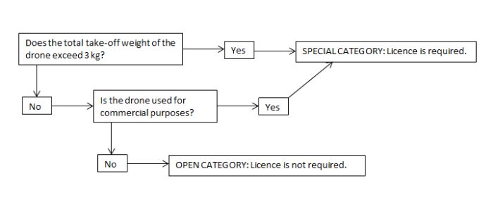 In order to determine the category of your drone and whether you need a licence or not, please follow this flowchart: