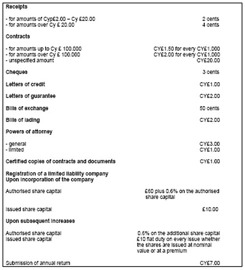 The table provided gives the amount or rate of duty payable on certain documents. Transactions which fall within the scope of reorganizations are exempt from stamp duty. Also, any contracts relating to assets situated outside Cyprus or business affairs that take place outside Cyprus are exempt from stamp duty. Nature of documents
