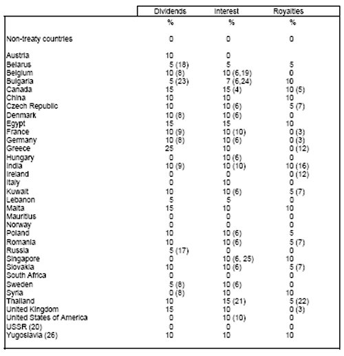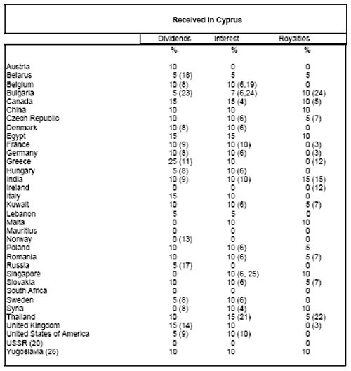 1. No withholding tax is imposed in Cyprus upon payment of dividends, interests and royalties to non-residents of Cyprus.