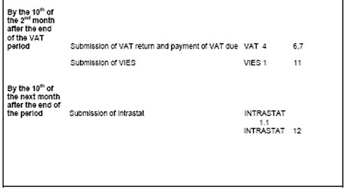 VAT returns must be submitted quarterly and the payment of the VAT must be made within 40 days from the end of each quarter.